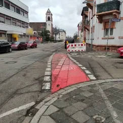 Außerdem bleibt das viel kritisierte Berg- und Talfahren auf den Hochbord-Radwegen über schlecht abgesenkte Bordsteine bei der Querung von Seitenstraßen für Radfahrer erhalten. Dies stellt ein erhebliches Sicherheitsrisiko dar, insbesondere wenn Schlaglöcher dazukommen, die z. B. in der Dunkelheit nicht gut zu sehen sind. Zusätzlich wird die Querung erschwert, da regelmäßig Kfz im Kreuzungsbereich stehen und die Sichtbeziehungen blockieren. In der Folge muss Radverkehr an jeder Querung entweder fast bis zum Stillstand abbremsen oder sich auf gut Glück in Gefahr bringen.