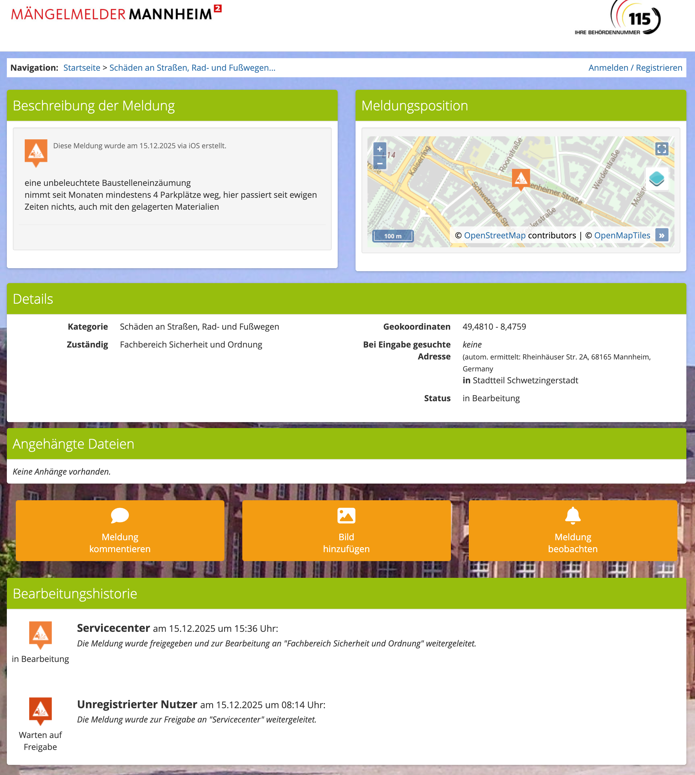 Eine Beispielmeldung im Mängelmelder Mannheim.