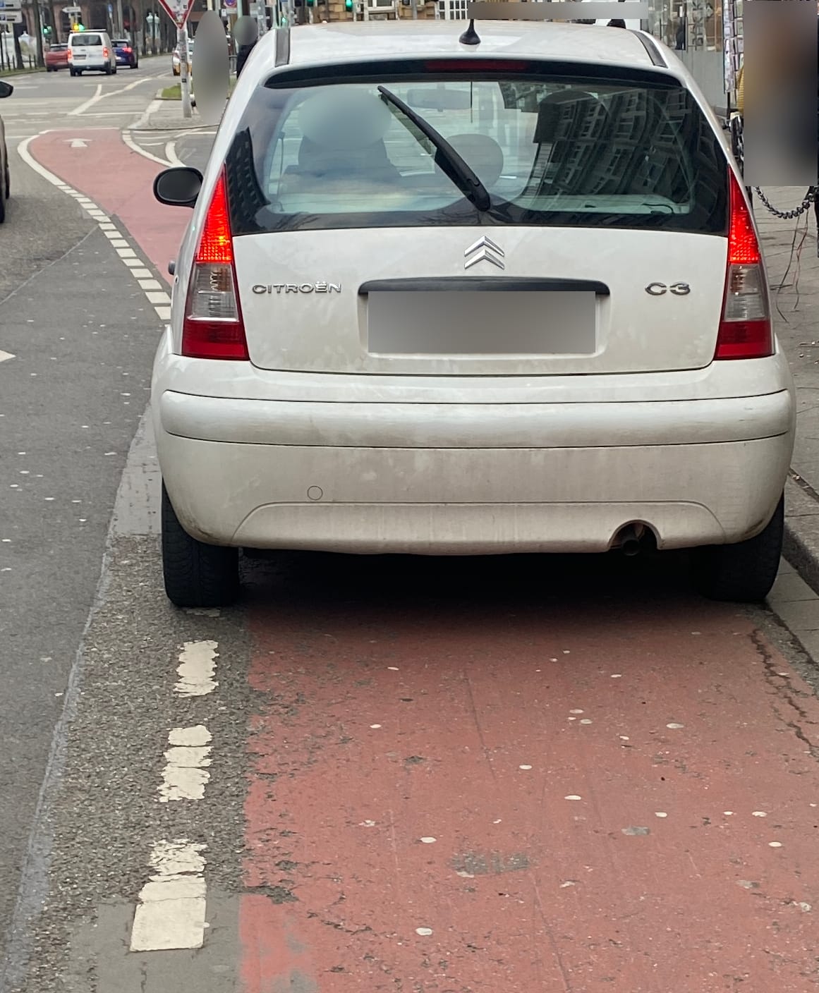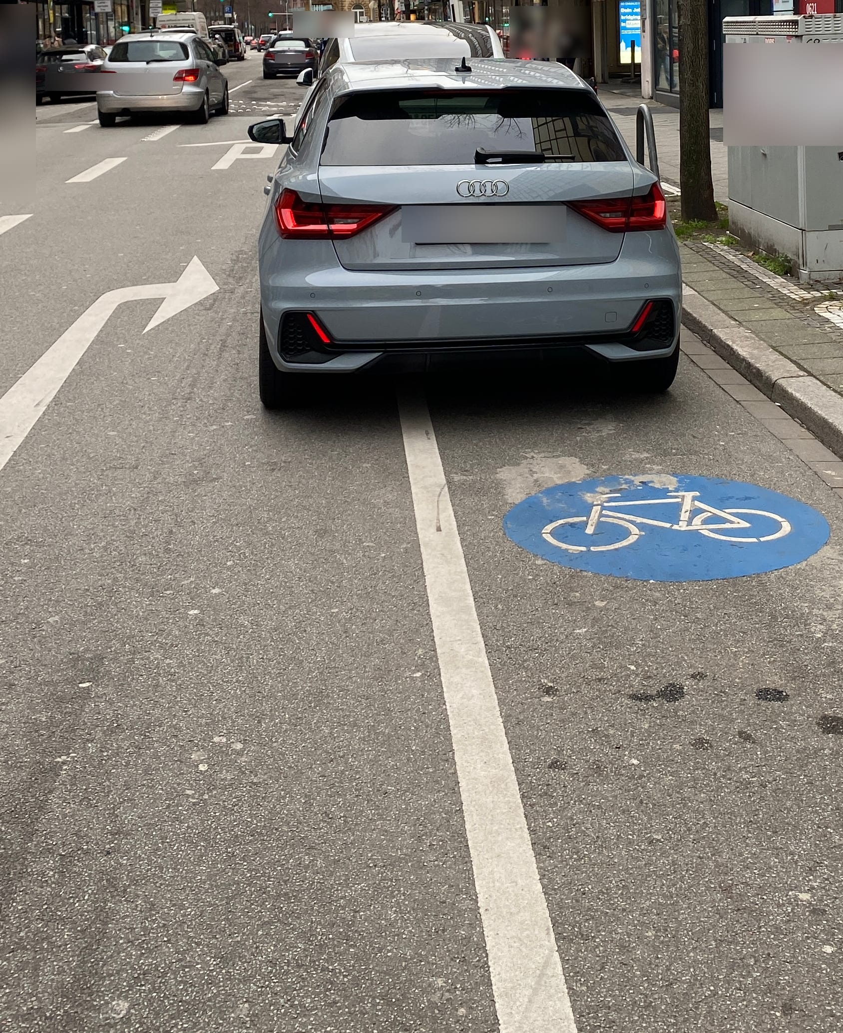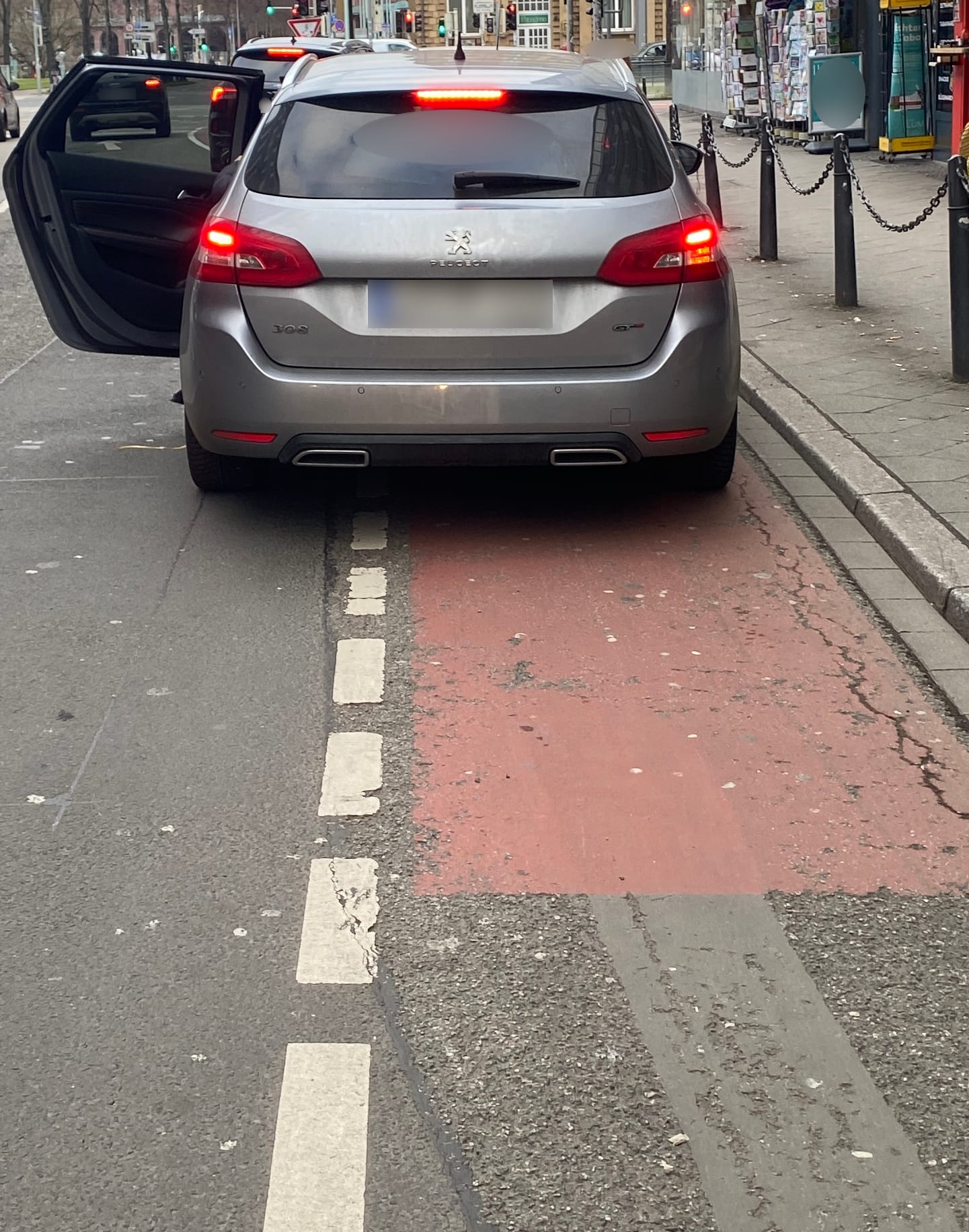 Tagsüber halten in der Kunststraße mit hoher Frequenz die "Nur-mal-kurz"-Parker mit eingeschaltetem Blinker oder Warnblinker und selbstverständlich mit laufendem Motor auf dem Radweg. Es vergehen oft drei bis zehn Minuten bis der/die Autofahrer*in weiterfährt.