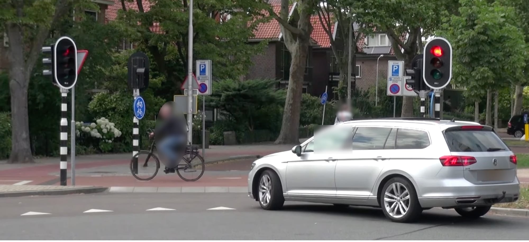 5. Vorfahrt für Radverkehr, Autos werden durch Ampel, die erst bei Bedarf auf Grün für Kfz wechselt, an einer schnellen Kurvendurchfahrt und der damit einhergehenden Gefährdung von Rad- und Fußverkehr gehindert, wie dies z. B. in Delft, Niederlande, der Fall ist.