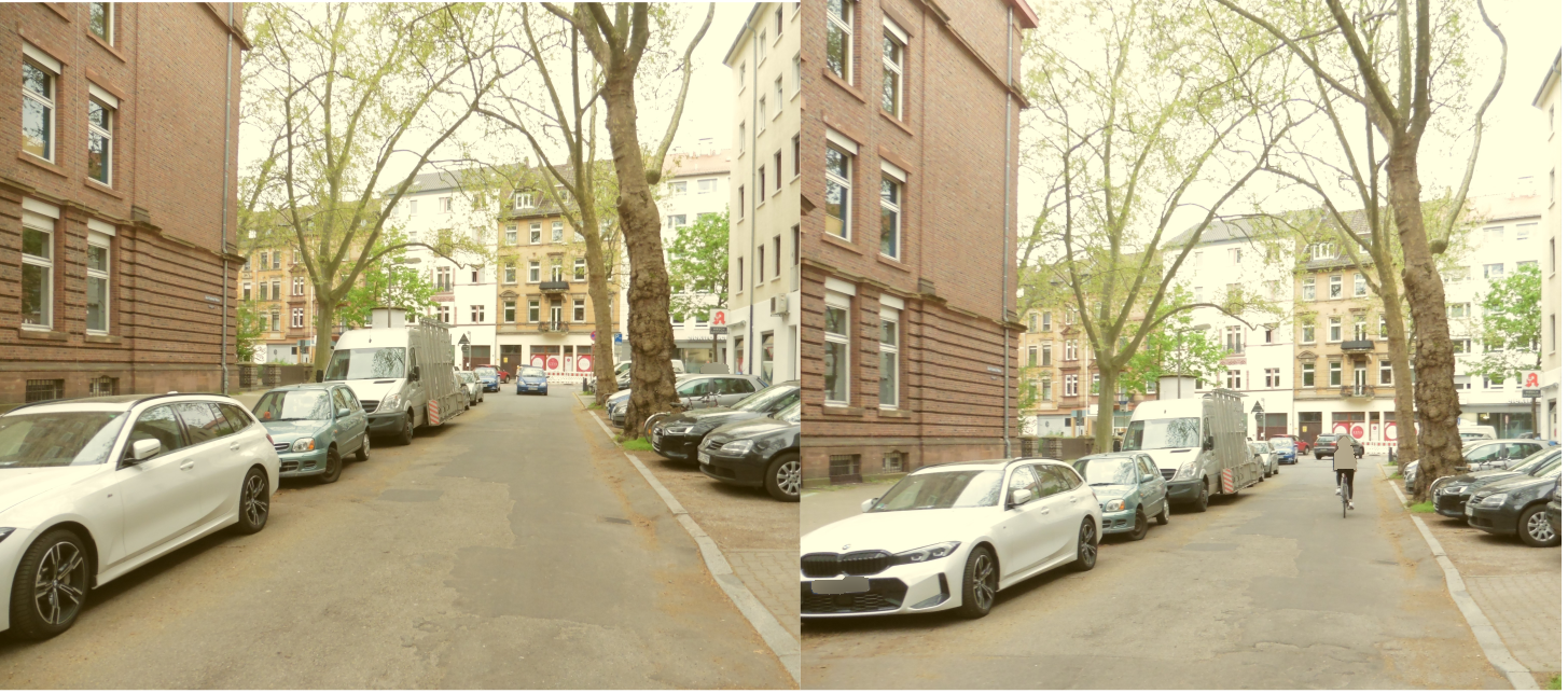 Auch hier ist eine Straßenseite zugeparkt mit Autos, nur eine volle Fahrspur steht zur Verfügung für Verkehr in beide Richtungen. Wenn man mit dem Auto von der Seckenheimer Straße hier einbiegt (wie das Auto im linken Bild), kann man nicht erkennen, ob 20 oder 30 m weiter jemand entgegenkommt. Es gibt aber keine Ausweichmöglichkeit nach rechts, weil Lücken zwischen den Parkplätzen fehlen. Die einzig anständige Lösung, wenn jemand per Fahrrad entgegenkommt: das Auto einen Moment halten, und ihn oder sie vorbeilassen. Denn die Fahrspur eines normal fahrenden Autos überschneidet sich hier mit der Fahrspur eines Fahrrads in der Gegenrichtung, von 1,5 m Sicherheitsabstand ganz zu schweigen!