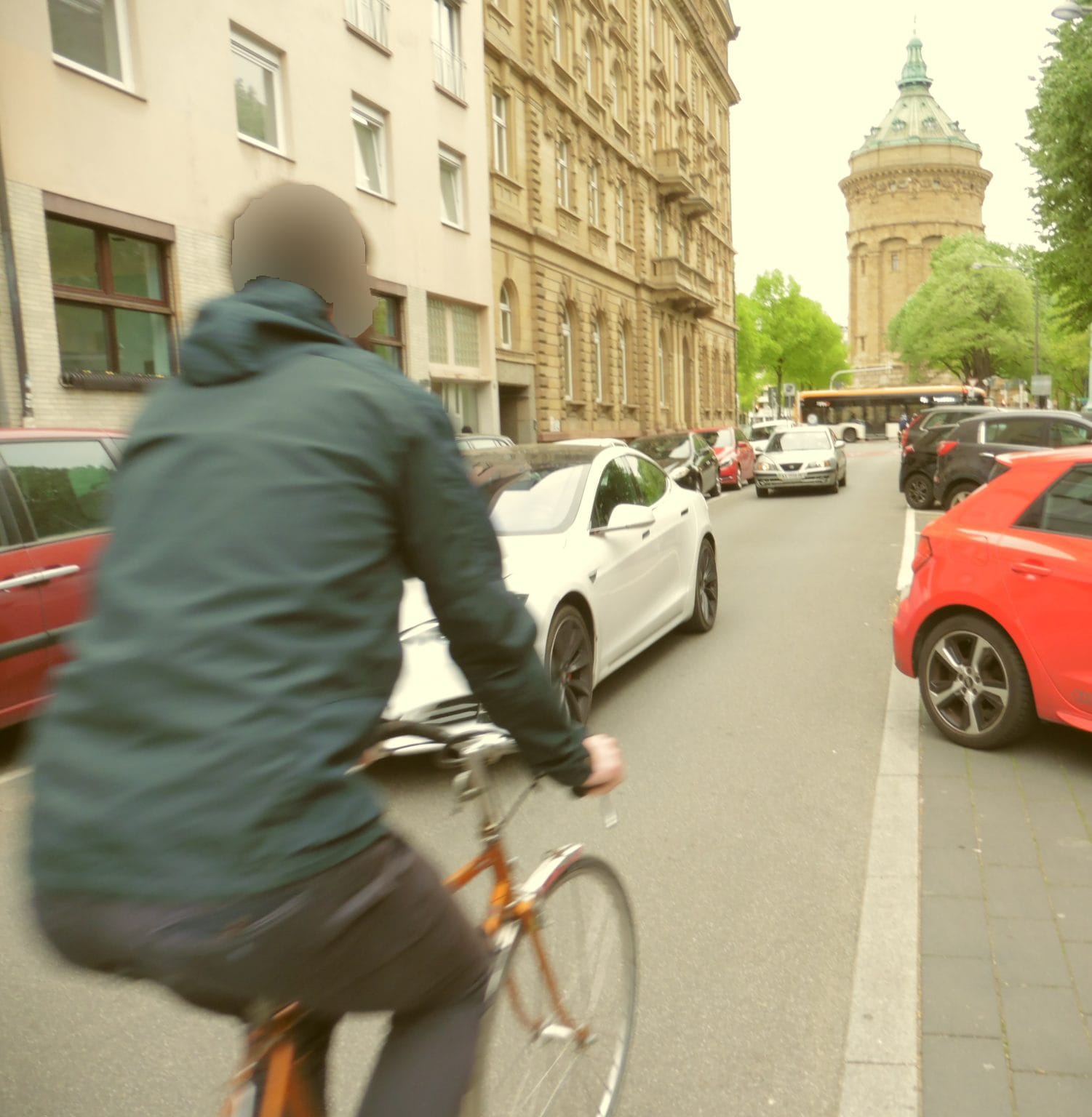 Autos dürfen hier nur in einer Richtung fahren. Sie brauchen die Straße vorwiegend, um an einen der Parkplätze heranzukommen (wobei es unter dem Wasserturm in direkter Nähe eine große Zahl von Stellplätzen gibt). Radlis dürfen in beiden Richtungen fahren, denn für sie ist dies eine wichtige Verbindung zwischen Hauptbahnhof, Innenstadt und Neckarstadt, parallel zum von Autos dominierten Kaiserring. In den Planungen zum Masterplan Mobilität 2035 ist diese Strecke übrigens sowohl Radschnellverbindung RSV, als auch Radvorrangroute RVOR. Auch hier: etliche Autofahrer sind nicht bereit, entgegenkommenden Radfahris Platz zu lassen oder kurz anzuhalten. Im Foto sieht man, wie der Radfahrer kaum Platz hat zwischen dem entgegenkommenden Auto und dem parkenden Auto auf der rechten Seite. Das Bild ist nicht gestellt, ich fotografierte dort bloß ein paar Minuten, bis sich diese Situation ergab.