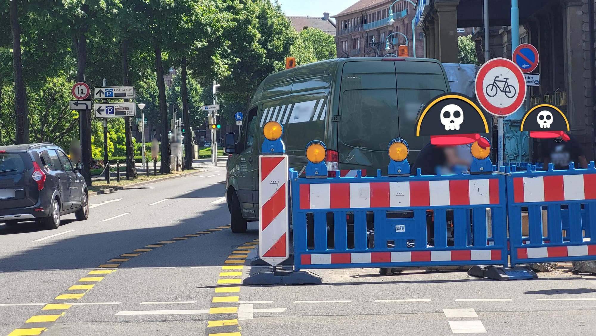 Eine paradoxe Situation für den Radverkehr: offenbar in bester Absicht wurde der Radweg umgeleitet, was leicht an der gelben Markierung zu erkennen ist. Dafür gilt den Planer*innen bei der Stadt unser Dank. Die Beschilderung jedoch macht die gute Stimmung wieder zunichte: laut dem Schild ist eine Durchfahrt für nicht motorisierte Zweiräder untersagt. Der Radverkehr muss ... ja was eigentlich? Leider haben wir oft das Gefühl, am besten wäre es, wenn sich die Radfahrenden in Mannheim einfach in Luft auflösen würden. Werden wir aber nicht. Wir werden weiterhin sichtbar sein und für eine bessere Verkehrsführung, nicht nur an Baustellen, eintreten.
